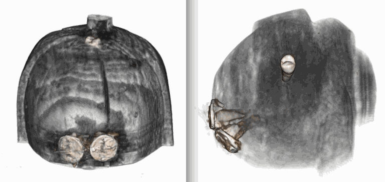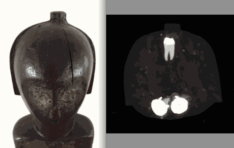 Four years ago I did a small study of the above Ntumu figure from Gabon; in my description I wrote: “Sometimes the eyes of byeri statues served as an opportunity for the integration of relics into the figure itself by embedding fragments of bone, often in the form of teeth, into deeply excaved cavities – which could be the case here.” A couple of weeks ago I was contacted by the current owner of this statue. He had taken the figure to his radiologist to test my hypothesis. A scan proved me right and revealed the presence of three human molars: 2 behind the eyes and 1 inserted in the forehead (which had not been spotted on the statue before) – a great discovery! Next time you have an appointment at your radiologist, don’t forget to bring an African statue :)