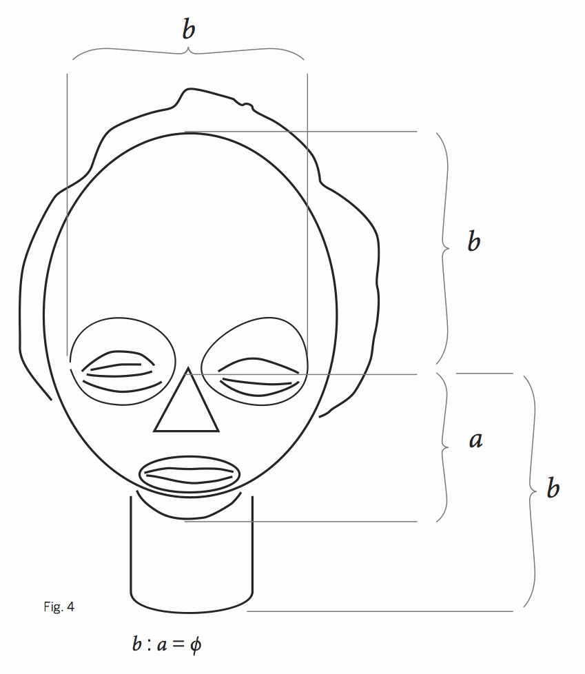 The ratio of the distances measured by aand b corresponds to a formula which is well-known in aesthetic studies and art history as the golden ratio of proportion. It has been observed in ancient Egyptian sculpture, Greek architecture, early medieval painting and was propagated widely during the Italian Renaissance, most famously in Leonardo da Vinci’s Vitruvian Man (1492) as manifestation of the divine spark visible in the greatest masterpieces of creation. This ideal proportion is mathematically defined by an irrational number that is approximately 1.618 and most often replaced by the Greek letter Φ.