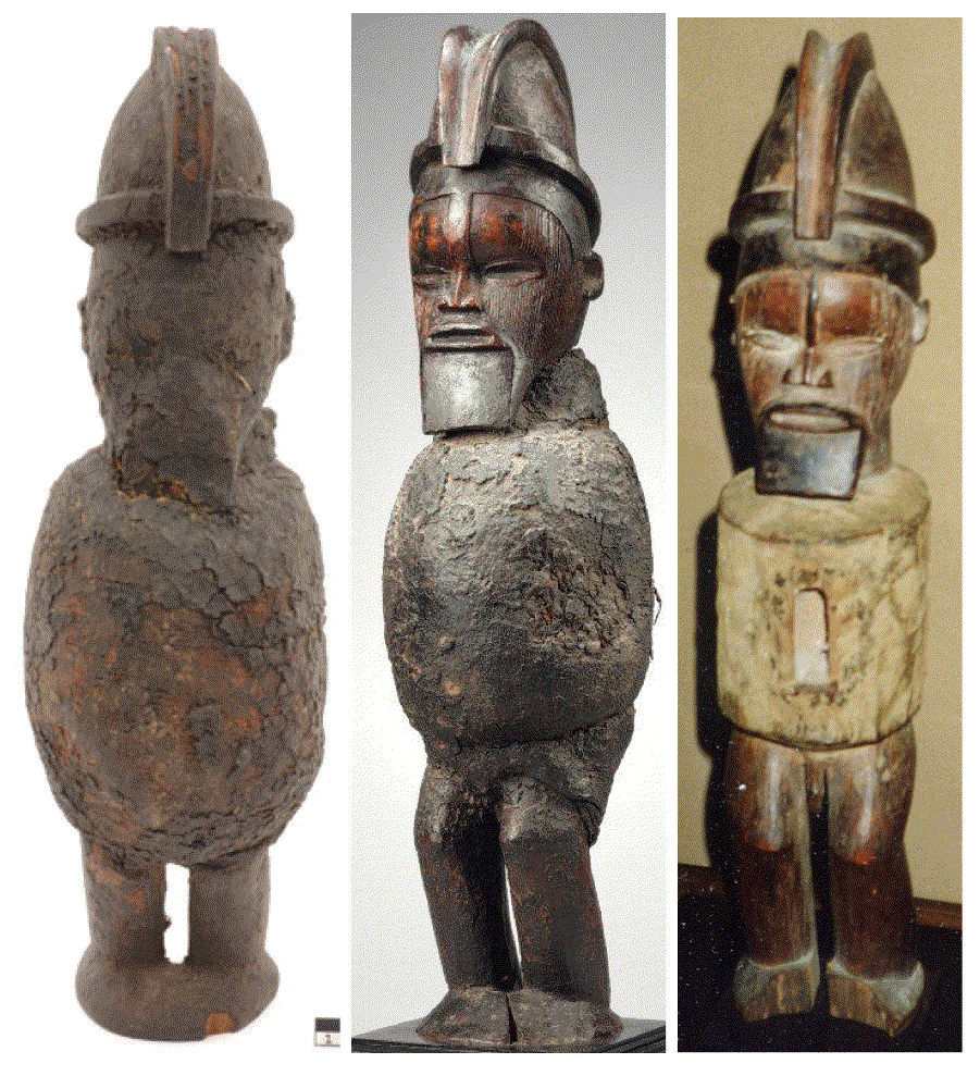 Left: Musée d’Ethnographie de Genève (ETHAF 012869). Height: 36,5 cm. Middle: Private Collection. Height: 49 cm. Right: Private Collection.A third figure from this carver (on the right above) was photographed by Guy van Rijn in the early 1990s at a Belgian dealer. Completely stripped from its attachments, it gives us the opportunity to see how the sculpture looks beneath the packed torso. There is a small additional cavity, created by the sculptor to accomodate the initial charge of the figure, and no arms were sculpted (they would be covered anyway). The above picture thus gives a good example of the different stadia of ‘cleaning’ that often took place after such statues arrived in the West.