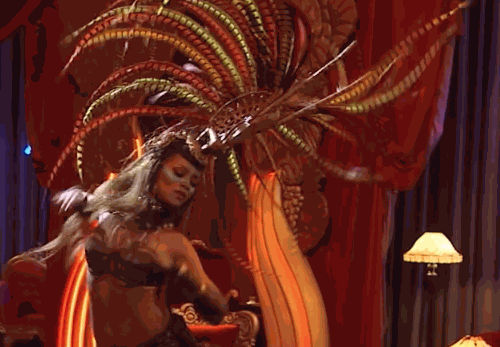 What follows is a stunningly CG-assisted dance sequence in which Rihanna changes outfits about 25 times! One of the identities Bubble takes on is a bikini-clad amazone-like dancer wearing a chiwara headdress! Below is a behind the scenes look of this moment in the movie (which happens to have been the most expensive film ever made in France!)..