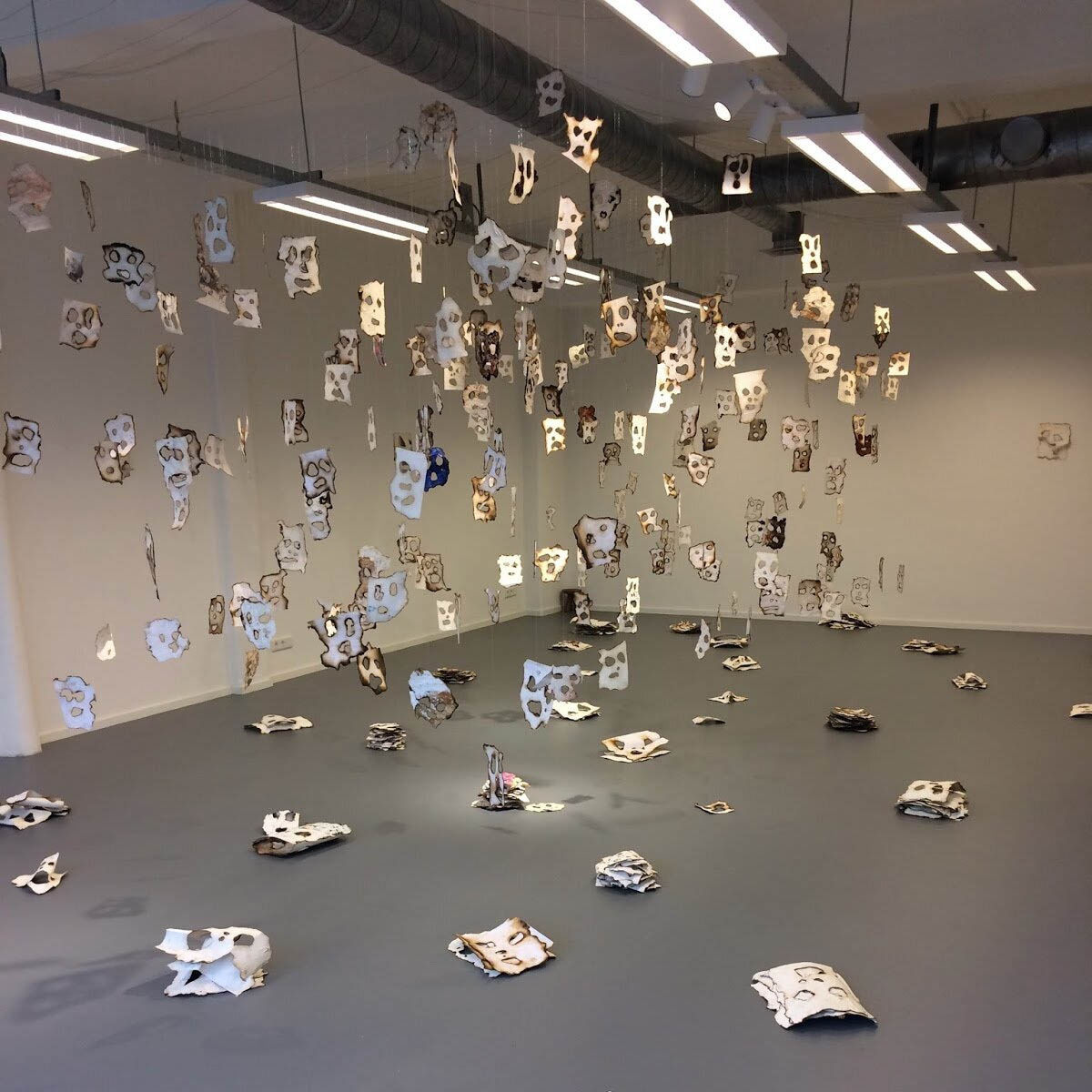 Oussou’s grand scale black drawings possess an absorbing quality, forcing the viewer to observe them up close. Another recurring visual element is the presence of white masks glued on the black surface. He explains, “Everyone can hide behind a mask. I don’t know your past or present, but perhaps there is something in my pictures that you recognise in yourself. Each mask is a person, an individual composed of several layers. Maybe you can identify with some part of my drawings.” The eyes, nostrils and open mouth are burnt into the face with coals, referring burn marks on one’s skin – “suffering feels like coals that burn on your skin”, the artist states. Oussou sculpts the faces with fire, embers recalling human struggle, in most unsettling expressions.
