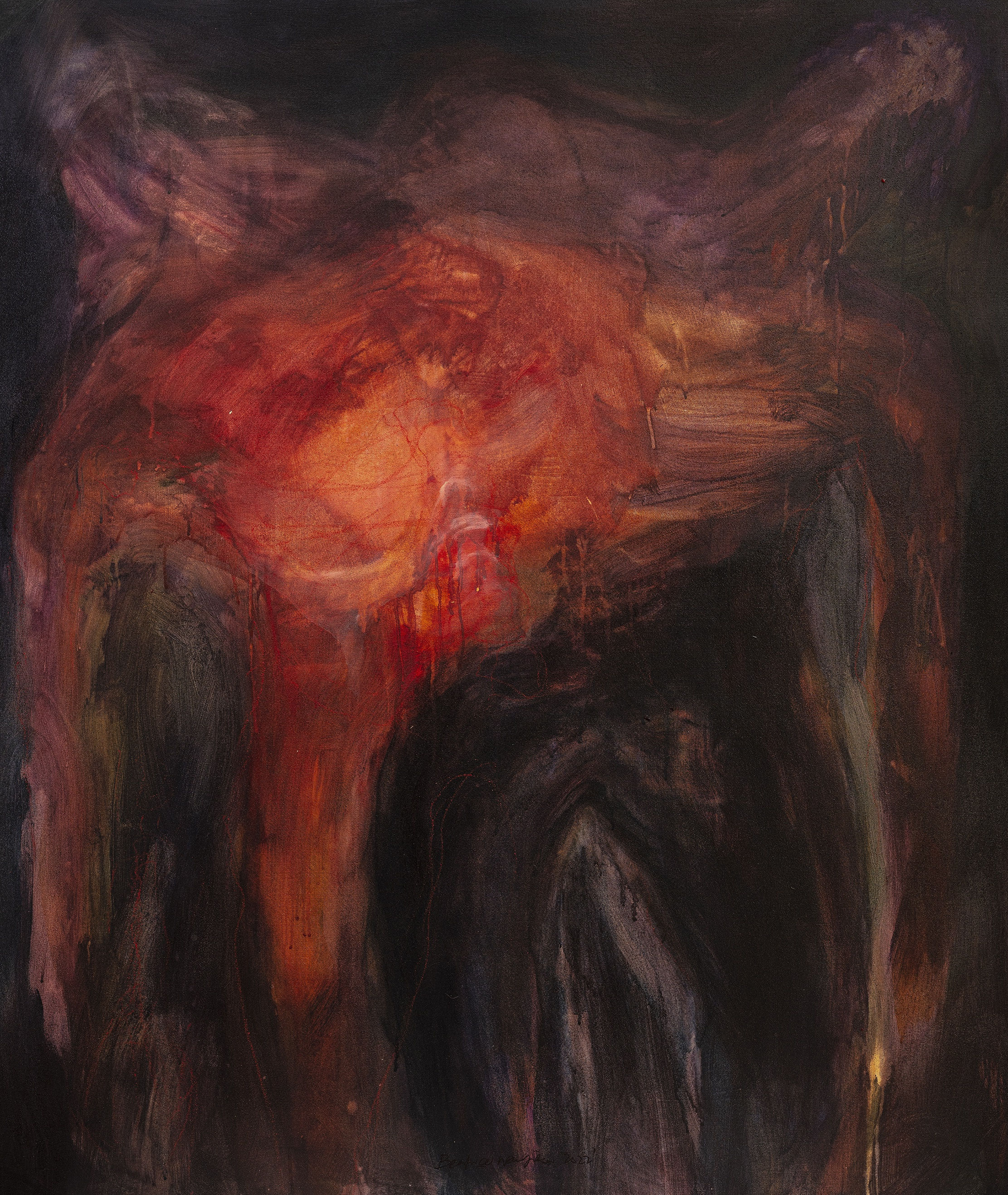 A prominent visual element in the featured works is her anatomical deconstruction of the human body, especially the ribcage, protecting the body’s essential’s guts. For Wanjiku, human bodies are a metaphor for our mental frame of reference. Her art has a larger, more universal message – as our human condition it is shared by all, notwithstanding physical differences in skin color, gender, or age. Wanjiku prefers to work with darkened hues, building up her portraits with a layering of flesh tones and shades of dark blue. The final layer is so thin it becomes see-through. Underneath, a brightness of red hues emerges from a womb like shape – suggesting re-birth. The womb suggests a reclaiming of a life and hope, filled with energy and power. Pregnant of possibilities, her paintings are metaphors for new beginnings, a rebirth within oneself. To peer into a painting of Wanjiku is to lose yourself in questions of being, of belonging and of existence.