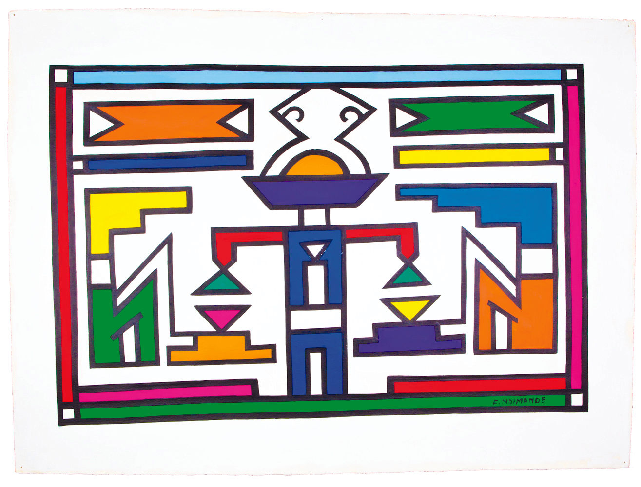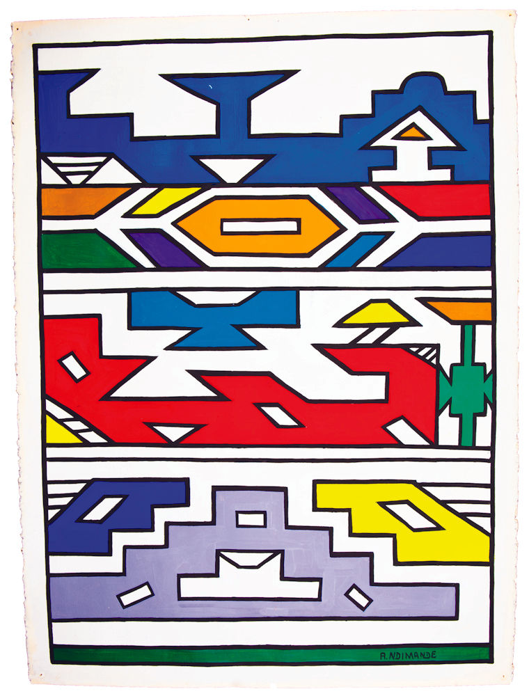 Together with the works by the internationally acclaimed artist Esther Mahlangu, the Ndebele art style has conquered the world since the early 1990s. The vividly colorful abstract designs, with their dynamic composition and color, have inspired innumerous fashion designers and other creatives. When comparing the works of Franzina Ndimande, Angelina Ndimande, and Anna Mahlangu a great deal of individual flair can be observed in the paintings. These three Ndebele artists exemplify the creative heights they can reach within the limitations of the classical Ndebele style. The traditional designs blend happily with their novel approaches and the use of a new medium, thereby creating a new chapter in Ndebele art history. The enthusiasm of Ndebele artists to start working on paper on the request of Alain Guisson illustrates their adaptability to change on the one hand and of their obstinate determination to maintain their traditions on the other, passing them on from mother to daughter.