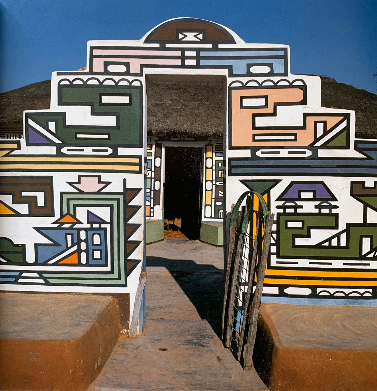 A fundamental aspect of the design units that compose these paintings is their symmetry. Generally, there’s a bilateral equilibrium along a vertical and/or horizontal axis. Motifs can be painted both forward and backward to create a harmony within the design field. This symmetry is more apparent in form of the design unit than in the application of color. Designs in Ndebele art do not symbolize specific cosmological or religious concepts, yet are adapted from various inspirations from daily life in South Africa. While the inclination for abstraction continues, new sources of inspiration now reflect modernity. Triangles, for example, habitually refer to electric light fixtures. Originally painted on walls, it is not surprising many of the design elements are architectural in nature. Houses, windows, and stairs can be rendered in triangles and rectangles, arrows, and step patterns.