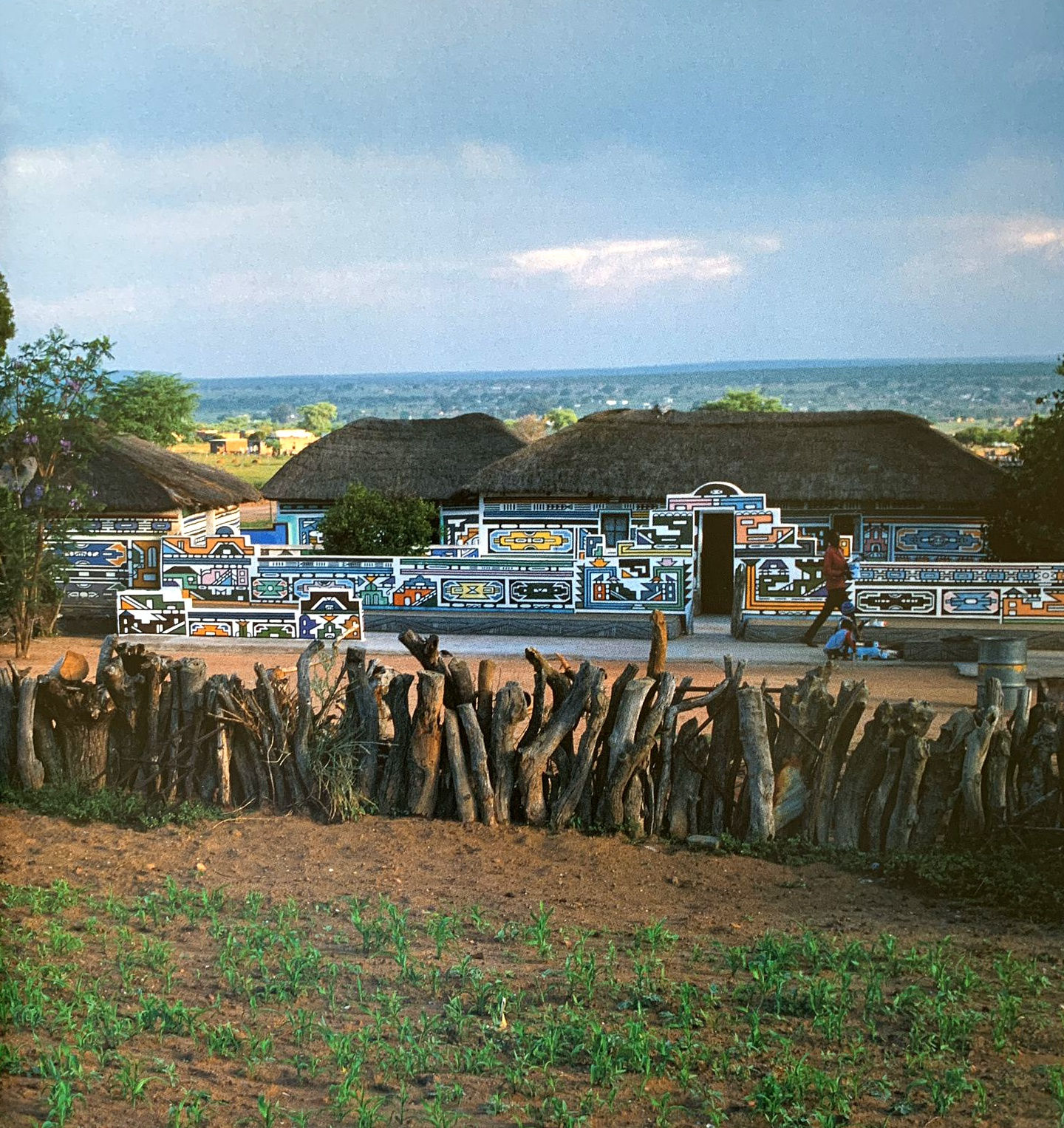 With its elaborate entrance gate and animal enclosure in the foreground, this is one of the finest examples of an Ndebele umuzi. Franzina Ndimande painted all of the buildings, assisted by her two eldest daughters. Image courtesy of Margaret Courtney-Clark.