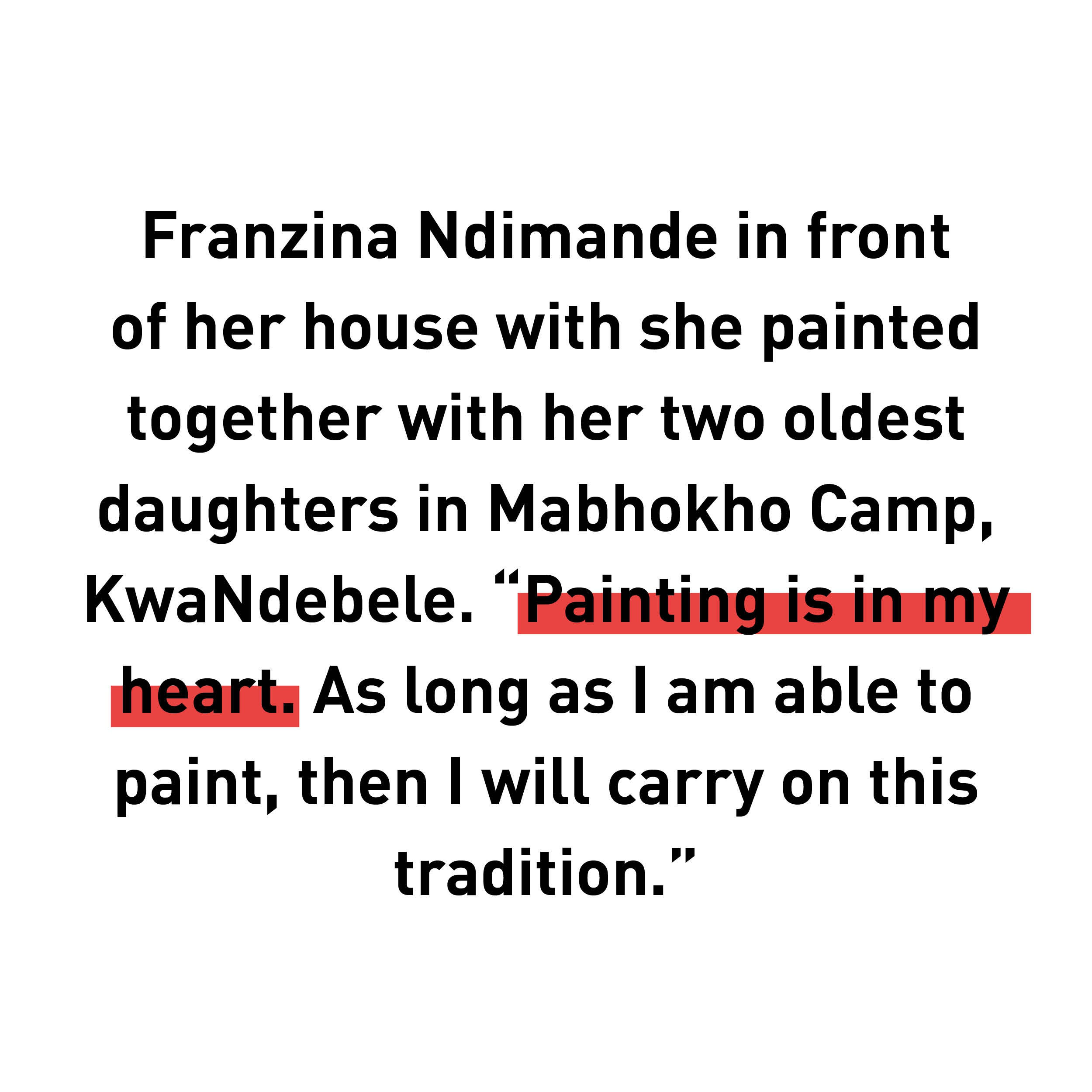 The paintings, just as murals and beadwork, are an art developed by a minority group within a polyethnic society to establish and affirm their identity. While the colorful Ndebele wall decorations are a relatively recent tradition, beadwork traditions go much farther back. Colorful beads have been worked onto aprons in elaborate geometric designs since the 19th century. Before the murals, Ndebele women had already developed a complex visual language in their beadwork patterns, which similarly served as markers of identity. Only with the availability of acrylic paints after the Second World War and the proliferation of larger houses with rectangular ‘canvases’, a gradual elaboration of the mud-plastered walls beyond the simple outlining of doors and windows emerged. Originally only colors made from natural pigments were available, but with the emergence of trading stores brushes and acrylic paints became accessible from the mid 20th century onwards. While still inspired by age-old visual traditions, this new range of vivid colors increased the graphic effect of the large murals significantly. A remarkable aspect of Ndebele painting is the fact that it is composed freehand, without preliminary drawings or the use of any other tools except the painter’s hands, her brush, and her innovative spirit.