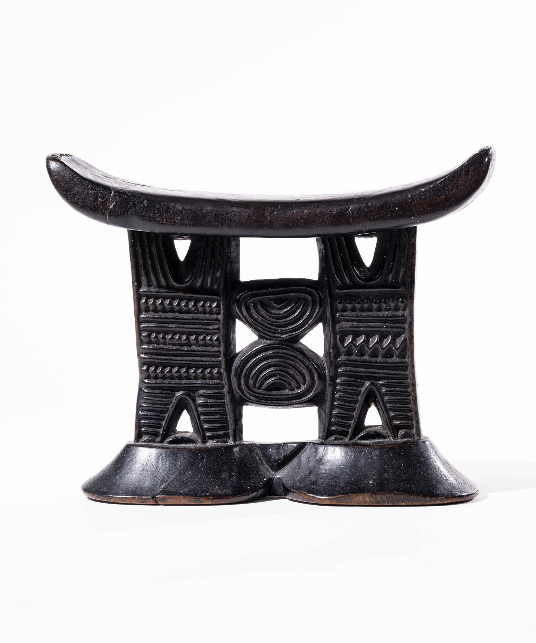 The standard Shona headrest usually adheres to the following parameters. The upper platform has no appendages and is decorated on the upturned ends of the platform with a chip-carved series of either parallel lines, diamonds, or a zig-zag line. The top surface of the platform can feature sets of triangles carved into it. The triangles usually are composed of smaller triangles within a larger one with the apexes pointing toward each other. The base is figure-eight shaped in plan, and gently tapers inward toward the central support. It has a downward-pointing V-shaped protrusions bisecting each side in the middle. The central support is composed of pairs of upward- and downward-pointing V-shapes separated by two or more circular shapes. These Vs have a series of two to three lines parallel to the Vs carved in them and the circles have two to four concentric circles carved within them. The centers of the circles can have various geometric designs in them, dots, horizontal lines, diagonal crosses or a pair of diamonds. The triangular spaces between the branches of the Vs and the central circular motifs are cut more deeply than the surrounding areas or are cut right through. Sometimes the circular motifs about each other and in the others they are separated by either a horizontal or vertical band filled with zig-zag lines, diagonal crosses or diamonds.