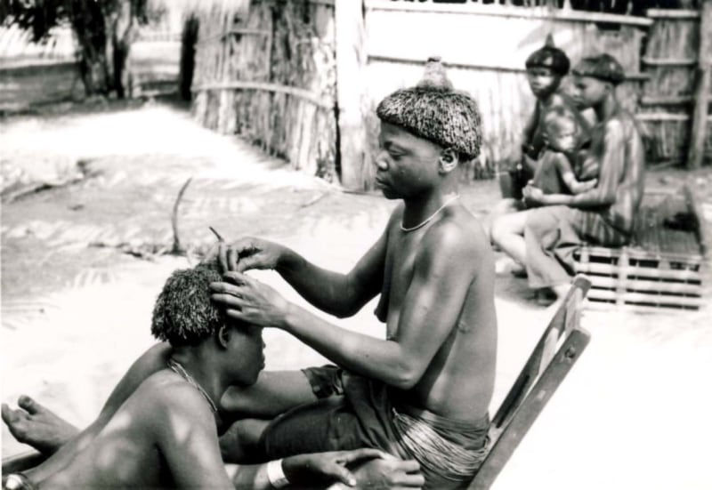 The traditional Pende hairstyle; the general shape is a bowl with hair braided into small coils often coated with palm oil. Photographed by Henri Nicolai in Nioka Kakese (Central Pende) in 1955 (published in Nicolai (Henri), “Le Kwilu. Etude geographique d’une region congolaise”, Bruxelles, 1963).