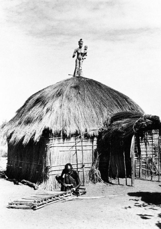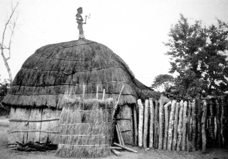 The “kibulu” (ritual house) of Chief Komba ornamented with a rooftop finial sculpted by Kaseya Tambwe, photographed by Carlo Lamote, ca. 1947 (published in: Strother (Zoë S.), “Pende”, Milan, 5 Continents, 2008:33, fig. 6).