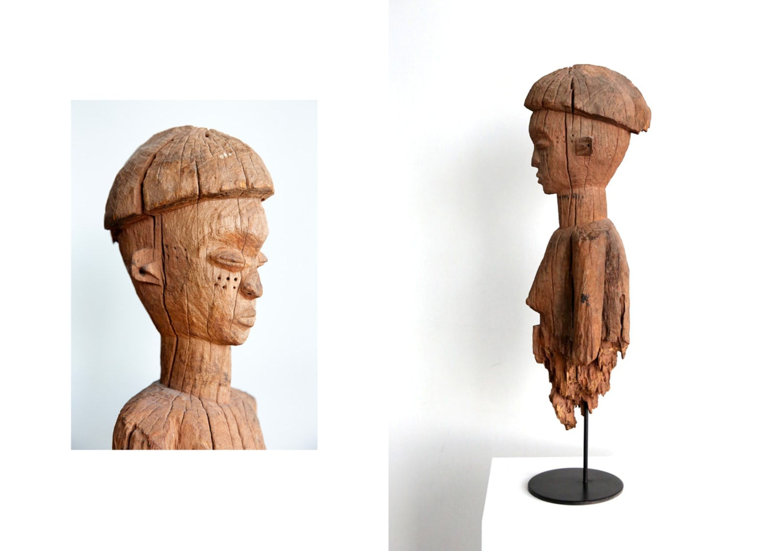 Position on the roof top, such figures were subject to the harsh climatic conditions. Originally painted red, rain and wind would erode the statue’s surface over the years. Additionally, this wooden figure has suffered major deterioration, likely caused once the chief’s abode collapsed after it became disused after his passing. It should be noted that the Pende deliberately avoid creating such statues out of permanent materials, such as stone or metal, there was not intention to make such powerful objects eternal, as each new chief had to commission his own figures, and people would be fearful to keep too many spirits around. The meditative gaze and eroded surface give this bust a timeless and universal appeal, while it continues to impress new onlookers.