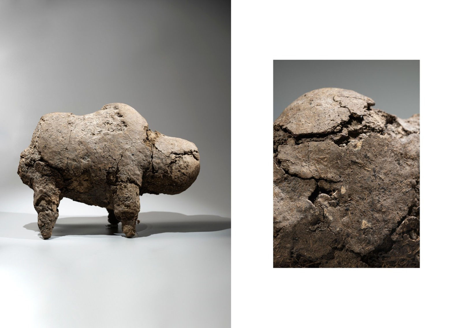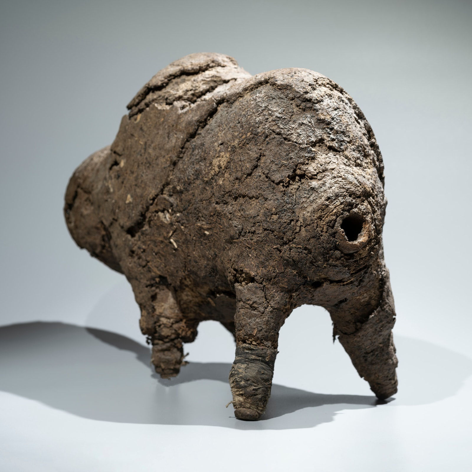 Among the most sacred objects among Mali’s Bamana people is the “boli”, which plays an essential role within their spiritual life. Boliw have attracted much attention from Western collectors due to their amorphous forms and unusual materials. Its cracked surface obscures the exact identification of the organic and inorganic materials assembled to create the “boli” (pl.: “boliw”) presented here. They are not carved, but rather assembled and molded around a wooden armature core that is wrapped in white cotton cloth, around which clay and sacrificial materials are encrusted.