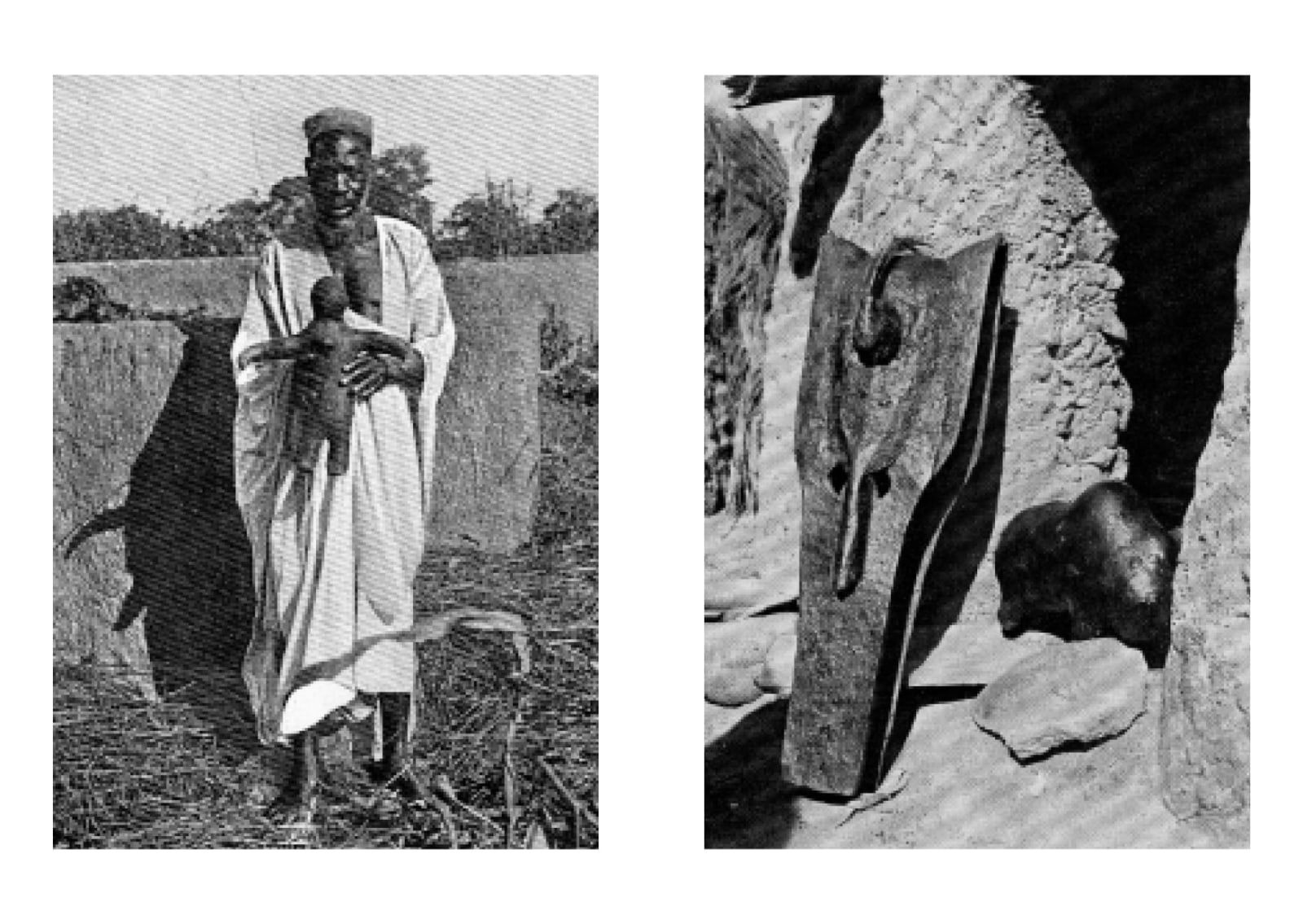 Left: The Bamana man Zanké and his anthropomorphic “boli” (published in: Henry (Joseph), “L’âme d’un peuple africain: Bambara.”, Münster, I.W., Aschendorffschen Buch, 1910). Right: Bamana kono mask and its “boli”, 1909 (published in Henry (Joseph), “L’âme d’un peuple africain: Bambara.”, Münster, I.W., Aschendorffschen Buch, 1910, p. 152).