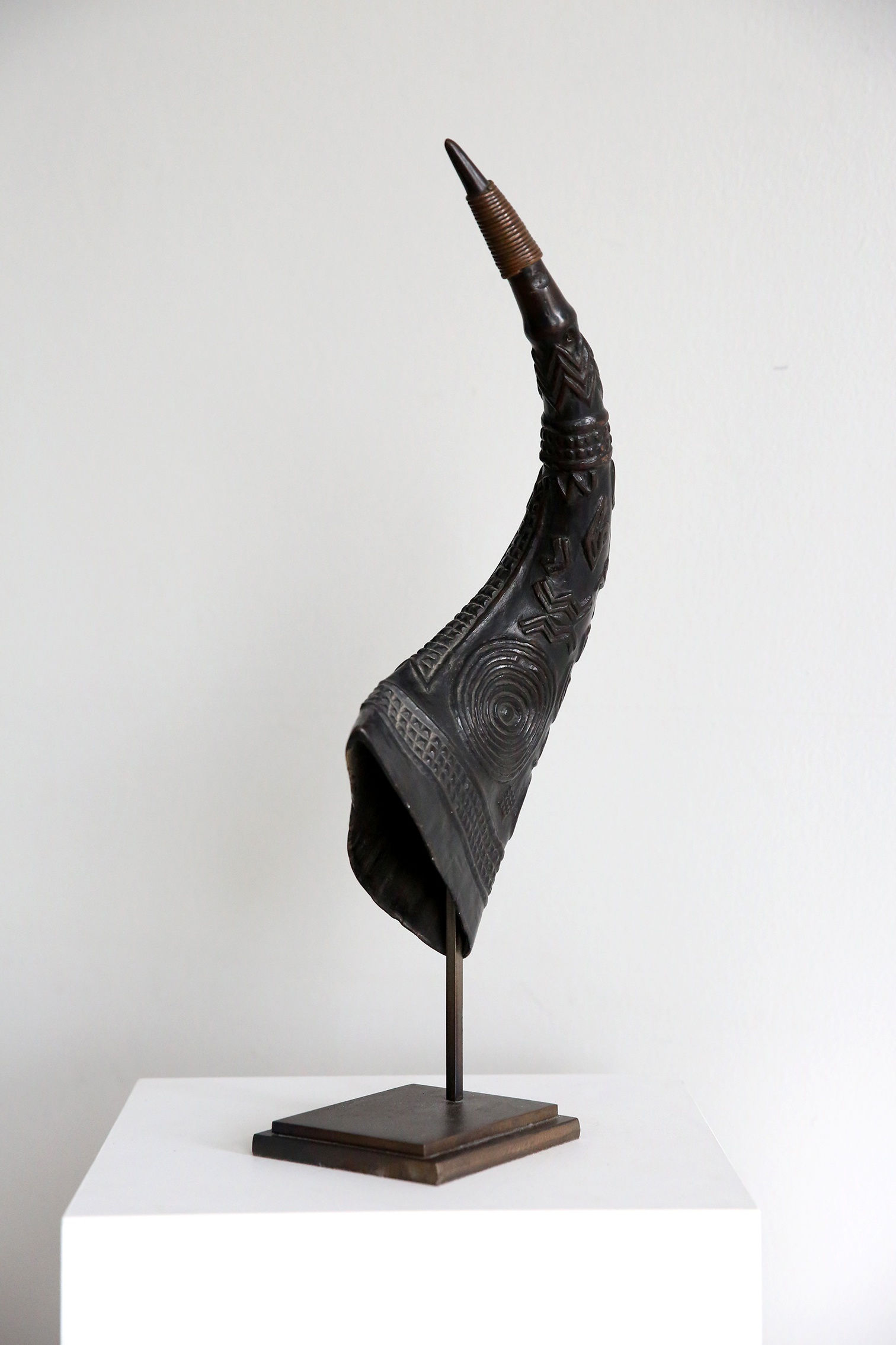Drinking horns and cups are among the many insignia that have denoted status in the highly hierarchical Kuba society since the kingdom’s foundation in the 17th century. Drinking vessels fashioned from the horns of the bush buffalo were exclusively used by specific Kuba noblemen as emblems of their title. The choice for this material must have been emblematic of the power of their owners.