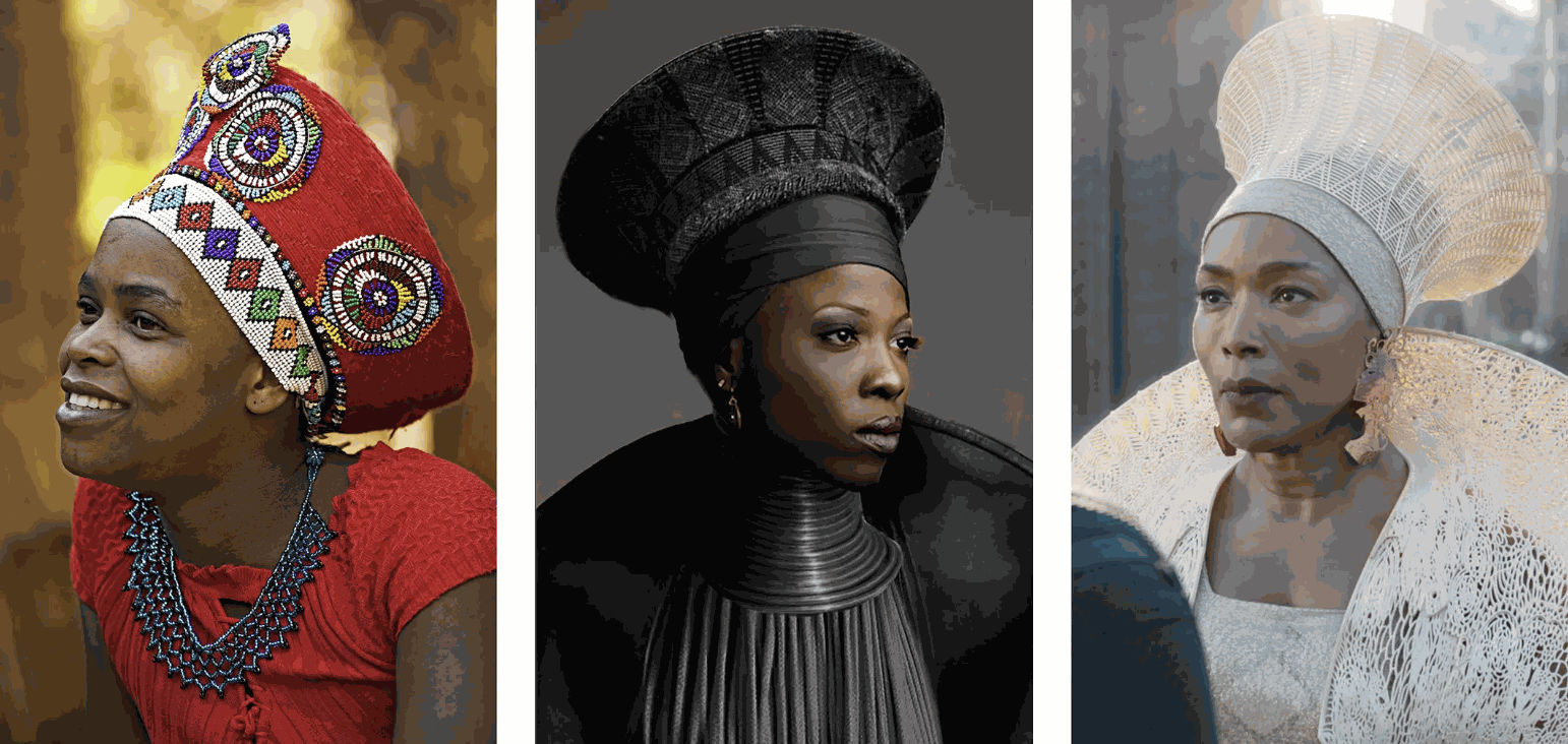 Left, a Zulu woman in the traditional headdress of a married woman; center, a conceptual costume sketch by Ms. Carter (design) and Ryan Meinerding and his team (concept artists); and right, the headdress as worn by Angela Bassett in the movie. Image courtesy of Getty Images; Marvel; Marvel/Disney.
