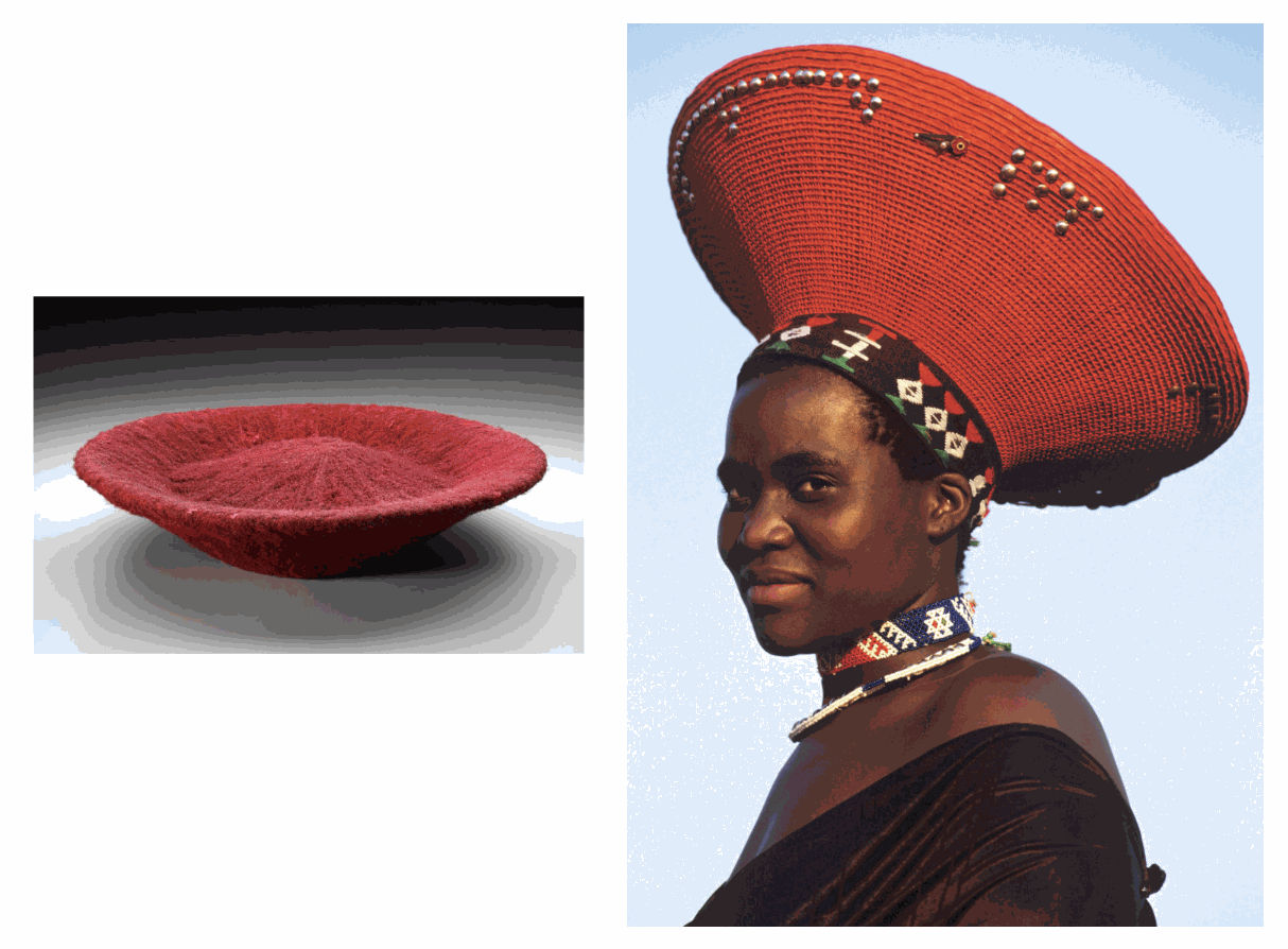 Left: A similar Zulu woman’s hat (isicholo). Cotton, human hair, red ochre over grass-fiber basketry frame. 10 x 46,5 cm. Collection Museum of Fine Arts, Boston (#2009.5342). Right: A Zulu bride from Natal in South Africa wearing a isicholo photographed in Tugela Ferry in 1996. Published in: Fischer (Angela) & Beckwith (Carol), “Une collection africaine: objets d’usage et de beauté - An African Collection: Objects of Use and Beauty”, Sotheby’s, Paris, 10 September 2007:53