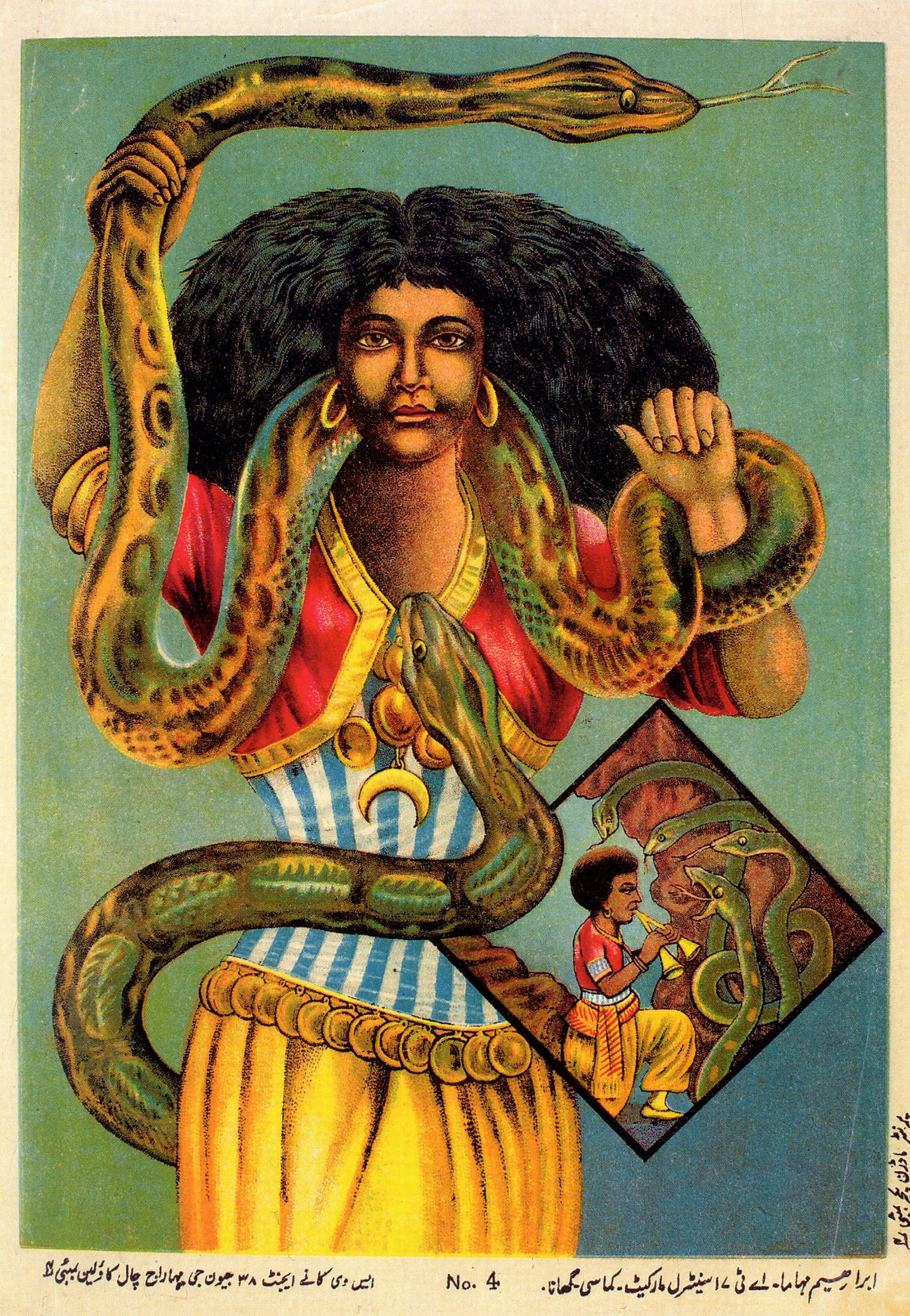 Hagenbeck hired a famous hunter named Breitwiser to travel to Southeast Asia and the Pacific to collect rare snakes, insects, and butterflies. In addition to these, Breitwiser, brought back a wife, who under the stage name ‘Maladamatjaute’ began to perform as a snake charmer in Hagenbeck’s production. A Hamburg studio photography taken about 1887 shows Maladamatjaute attired for her performance. The style and cut of her bodice, the stripes made of buttons, the coins about her waist, the armlets, the position of the snake around her neck and a second one nearby, the nonfunctional bifurcated flute held in her hand, and her facial features and coiffure: all duplicate those seen in a snake charmer chromolithograph from the Friedländer lithographic company, the original of which has not yet been found. What we do have, however, is a reprint, made in 1955 in Bombay, India, by the Shree Ram Calendar Company from an original sent to them by two merchants in Kumase, Ghana. There can be little doubt, therefor, that Maladamatjaute was the model for the image. Her light brown skin placed her beyond Europe, while the boldness of her gaze and the strangeness of her occupation epitomized for Europeans her ‘otherness’ and the mystery and wonder of the ‘Orient’. As Maladamatjaute’s fame as a snake charmer spread, her image began to appear in circus flyers and show posters for the Folies Bergères in Paris, as well as in the United States. Soon after, and probably unknown to Maladamatjaute, her image spread to Africa – but for very different reasons and imbued with very new meanings. (op. cit., pp. 50-52). In the nearly one hundred years since the arrival of the snake charmer print in Africa (and especially after twelve thousand copies were printed in Bombay, India, in 1955, and sent to traders in Kumase, Ghana), the image has traveled widely, first in West and subsequently in Central Africa. Various copies of copies continue to circulate widely in sub-Saharan Africa, where, as of 2005, Henry Drewal discerned the influence of the print in at least fifty cultures in twenty countries! (op. cit., p. 54).