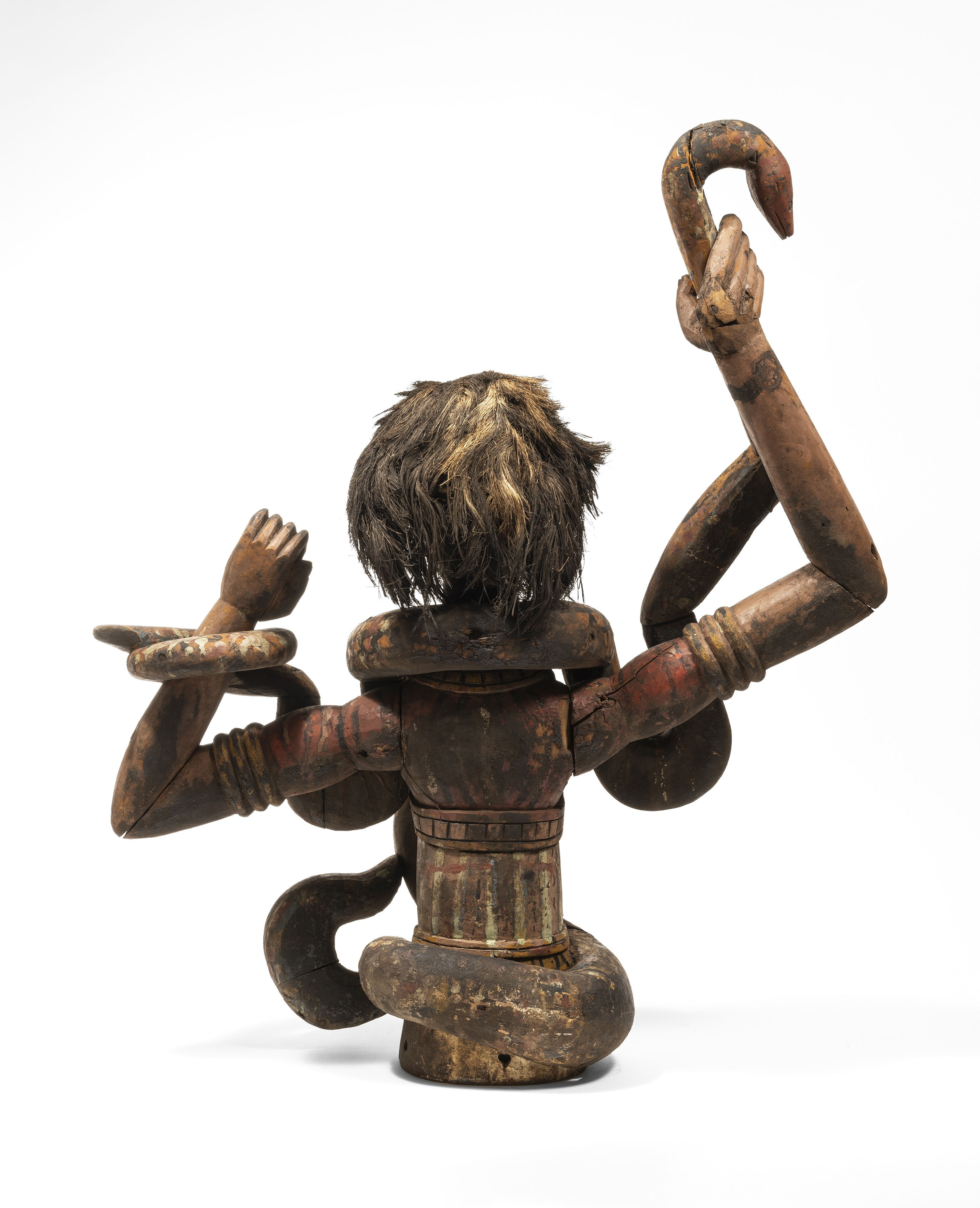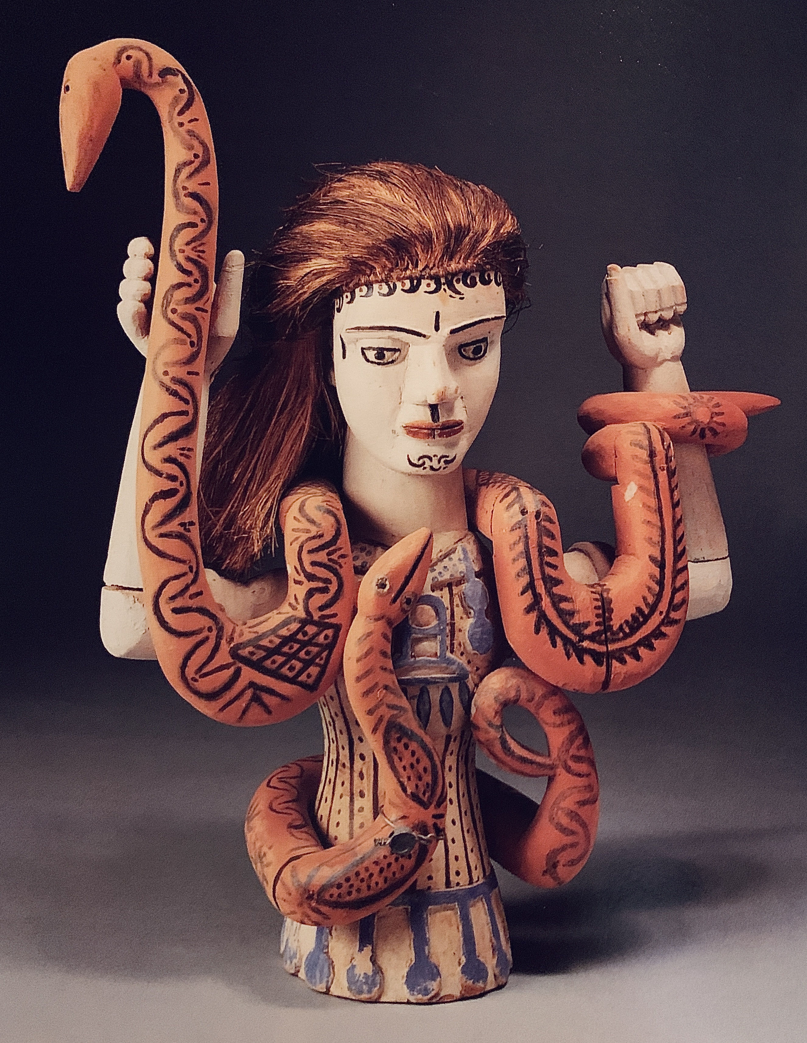Art’s inspiration easily crosses borders, across space and time, the present exceptional ‘Mami Wata’ headdress being a perfect example. For too long African material cultures have been considered as closed systems without any outside influences; yet the origin of their inspirations, as we will see, can go way beyond the usual. ‘Mami Wata’ is such a unique pan-African phenomenon with a long and global history. The artist who carved this magnificent Ibibo headdress from Nigeria was inspired by a then 50-year-old German postcard of an Indian snake charmer active in Hamburg and abroad in the 1890s. The iconography struck a chord and was explicitly copied in a syncretic iconographic style, blending Ibibio stylistic elements with the outside influence. The theme of Mami Wata, appears in myriad forms, including mermaid and snake charmers, with varying devotional practices through sub-Saharan Africa. Henry John Drewal’s 2008 publication “Mami Wata – Arts for Water Spirits in African and Its Diaspora”, coinciding with an exhibition at the Fowler Museum at UCLA in Los Angeles, gives an excellent overview of this phenomenon.
