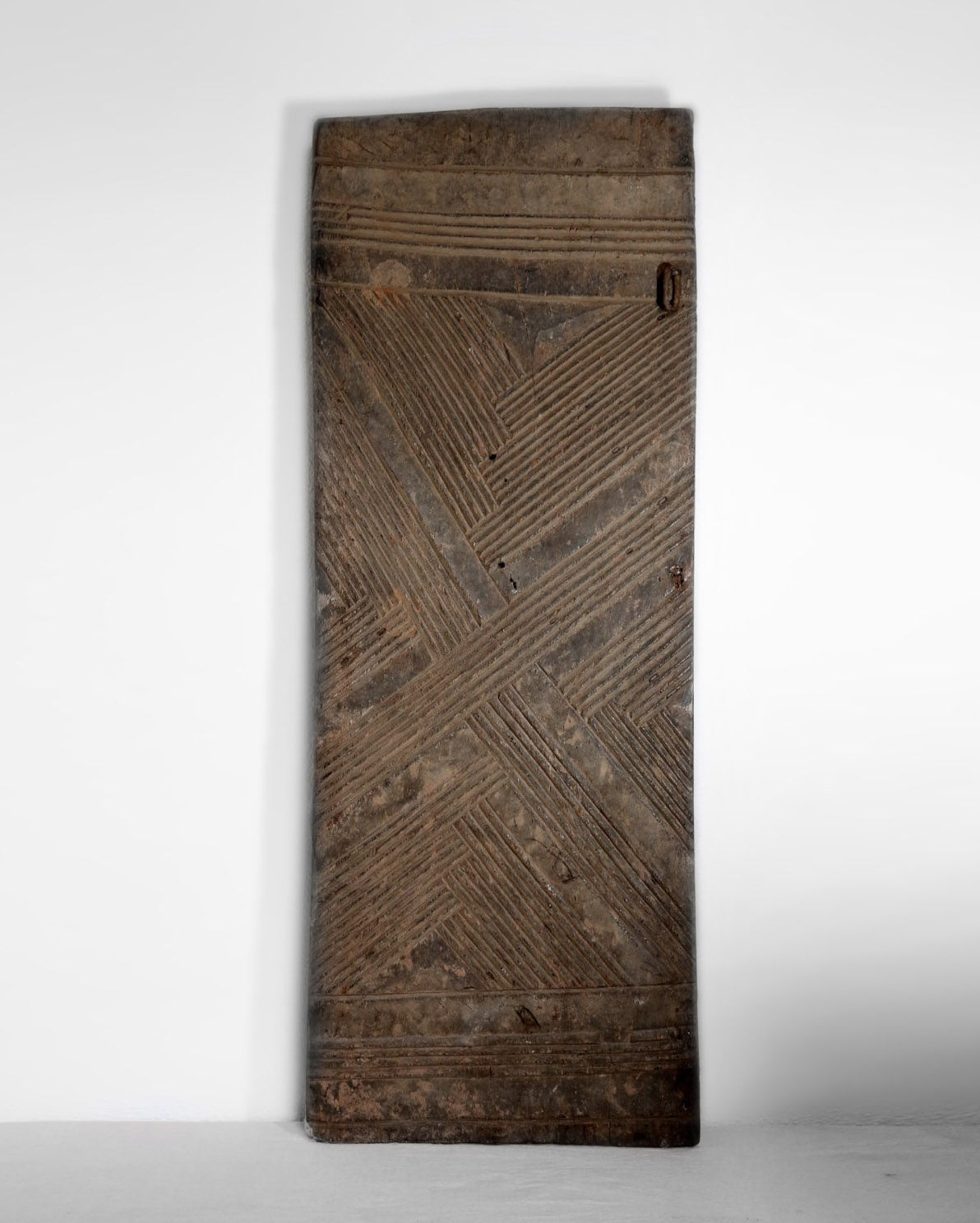 One or more slabs of African oak, widely known as iroko (Chlorophora excelsa; in Igbo as oji) formed wall and door insets at the entryway of the main compound. The large planks were extremely difficult to cut from the dense wood of the iroko tree and measured approximately 1-1.5 meters high and nearly a meter in width. Several individual panels could span the entry, with one acting as a door that swiveled on fixed pivots. A pull cord or iron chain affixed to its center served as a doorknob. Individual units were secured in an upright position with iron clamps joined to vertical supports and lintels. These ensembles differed from ordinary portals not only because of their size but also because of the rich designs carved in relief on their public side. Each panel was decorated differently, yet mgbo ezi are unmistakable for their unity of geometric patterning. Diamonds, squares, rectangles, and triangles are juxtaposed on fields of rich textures created by narrow grooved hatchings and tiny, dentated studs. Symmetrical distribution in grids accentuates the ordered precision typifying mgbo ezi designs. The repetition of striations, curved and angular, lends to the ordered precision typifying mgbo ezi designs. The repetition of striations, curved and angular, lends to the surface an illusion of compressed energy, resulting in oscillating rhythms reminiscent of Op Art illusions. The diminutive serrations and elongated lines catch and reflect light with the full strength of the sun’s rays. (op. cit., pp. 49-50).