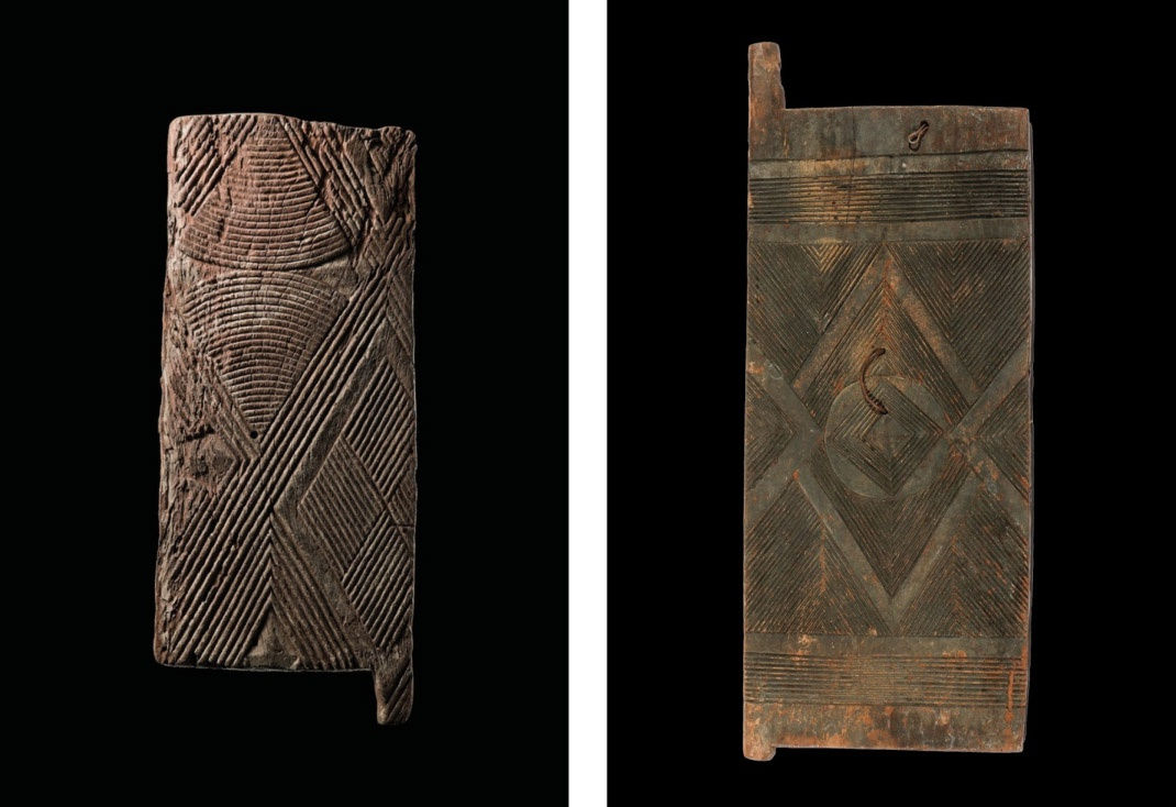 Mgbo ezi are distinguished by the careful carving into V-shaped grooves and the contrasts of plain with densely carved areas. In his book ‘Niger Igbos” (London, 1966, p. 316) Basden was the first author calling the typical sculpting style “chip” carving. Neaher hesitated to employ the term since for her it evoked the ancient Viking/Celtic decorative device of curved lines of V-shaped indentations on metal jewellery. In contrast, Igbo patterns were quite varied. However, John Boston in his book “Ikenga Figures among the North-west Igbo and the Igala” (London, 1977) also used the term, while differentiating northern Igbo sculpture in a ‘chip’ and ‘smooth-plane style, and ever since the term has been continuedly used to describe the region’s typical woodcarving style. Neaher has suggested that the typical relief carving possibly is inspired by the northern Igbo tradition of facial scarification. Such itchi marks consist of a series of narrow parallel lines incised on the forehead and temples of initiated northern and western Igbo men. As the initiation of young men into ozoincluded the itchi cutting, the facial scarification proclaimed high rank, while also being instrumental in the attainment of this position. According to Neaher, Itchi’s unique design of hatched lines recurs in the sculptural arts, suggesting a shorthand for masculine achievement and excellence. The foreheads of human statues indeed sometimes bear itchi, while the striated patterns on ozo stools, bowls, and other ritual objects appear to allude to itchi as well. Itchi’s extension to titled door panels, as fields of striated grooves, could accord with these usages. (op. cit., pp. 52-53)