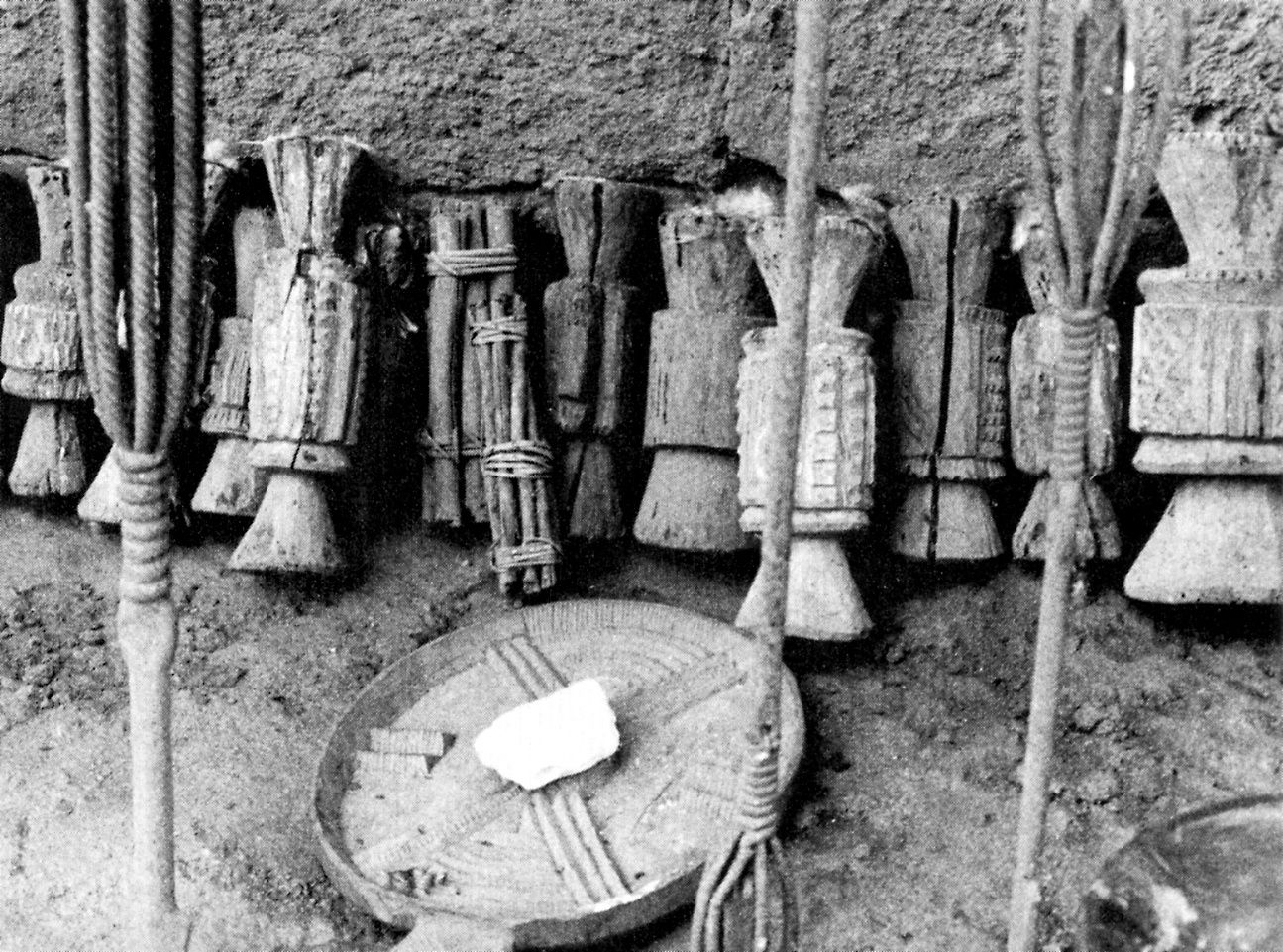 Okposi, bound umuada, ‘daughters’, sticks, a chalk serving plate, and details of wrought-iron staffs. Photographed by Herbert M. Cole in Ezeagulu Aguleri in 1983. Published in Cole (Herbert M.) and Aniakor (Chike C.), “Igbo Arts, Community and Cosmos”, Museum of Cultural History, Los Angeles: University of California, 1984, p. 11, #25.
