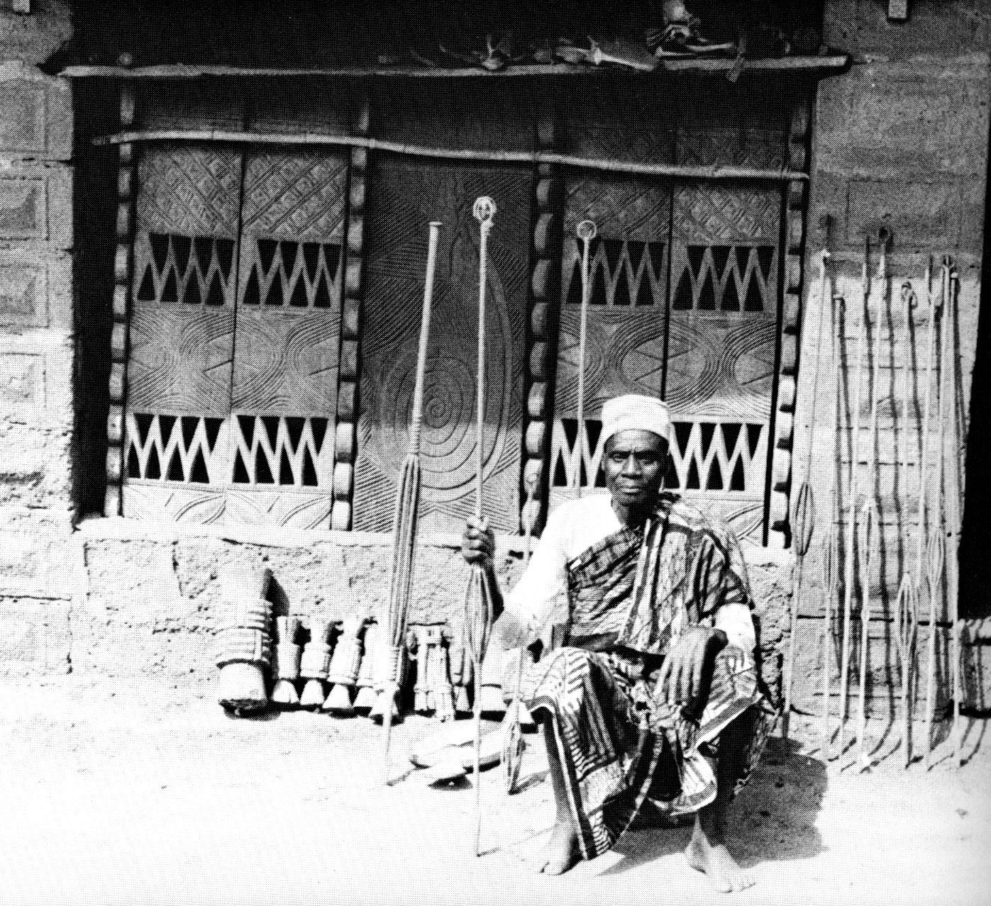 Transitional cement obi with traditional ‘eyes of spirits’ panel plus the okposi and staffs which are normally enshrined on the altar behind the panel. Photographed in Ezeagulu Aguleri by Herbert M. Cole in 1983. Published in: Cole (Herbert M.) and Aniakor (Chike C.), “Igbo Arts, Community and Cosmos”, Museum of Cultural History, Los Angeles: University of California, 1984:66, #111.