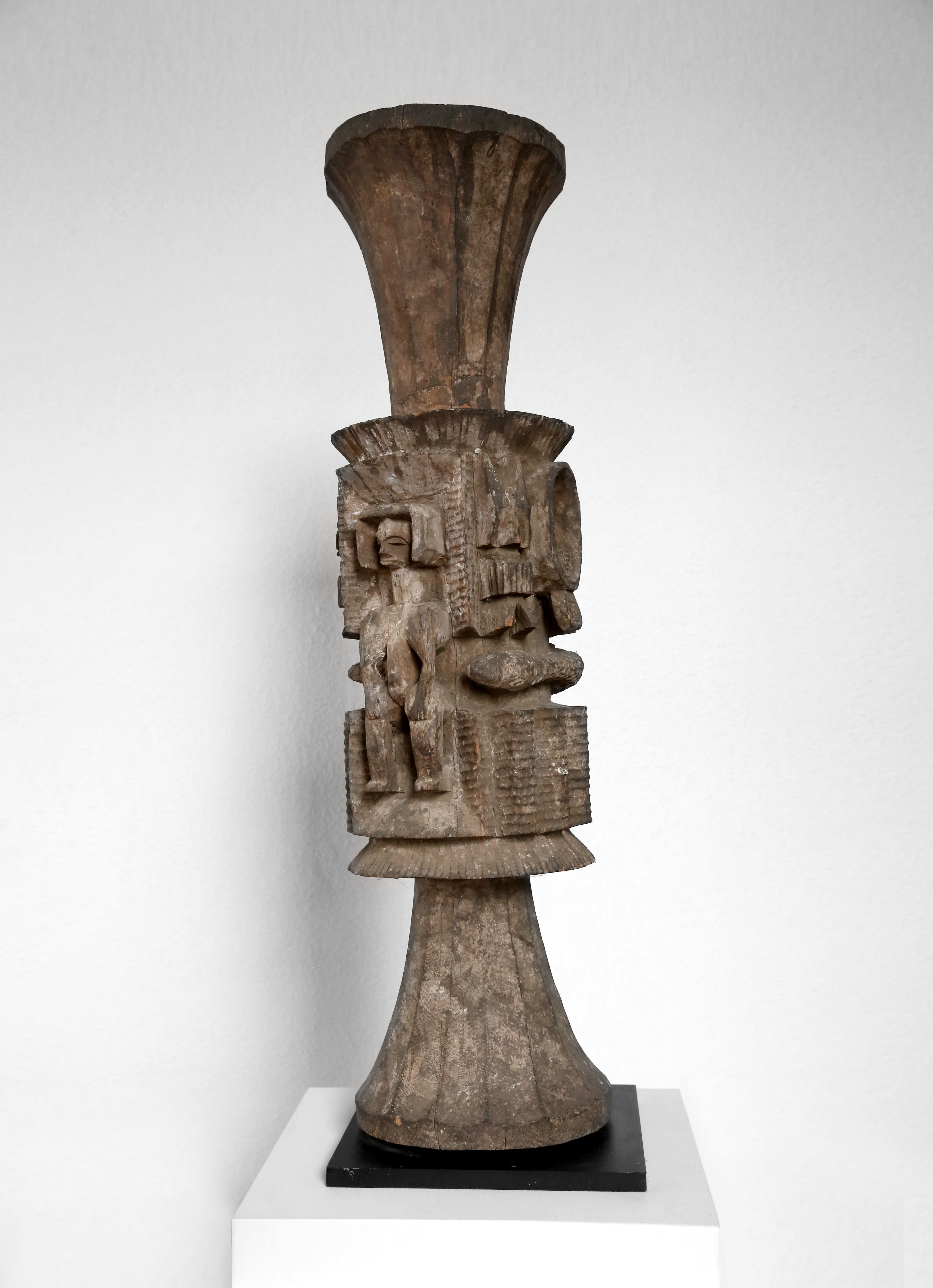 According to the scholar Herbert Cole, this abstract cylindrical sculpture likely is an okposi, which was typically kept together with ikenga and other title-equipment in an obi or titled man’s compound (personal communication, 15 October 2015). Frank Starkweather refers to okposi or okpensi as being single shrine figures to the ancestors, found in the gate houses to the traditional compounds where men gathered and received their visitors (Starkweather (Frank), “Traditional Igbo Art: 1966”, University of Michigan, 1968, p. 70). Eli Bentor wrote that such a carving was kept in the irummo, the personal shrine within the obi. The owner made offerings to it whenever he wished to ensure success in any kind of venture (Bentor, Eli, “Life as an Artistic Process: Igbo Ikenga and Ofo”, African Arts, Vol. 21, No. 2, 1988: p. 70).