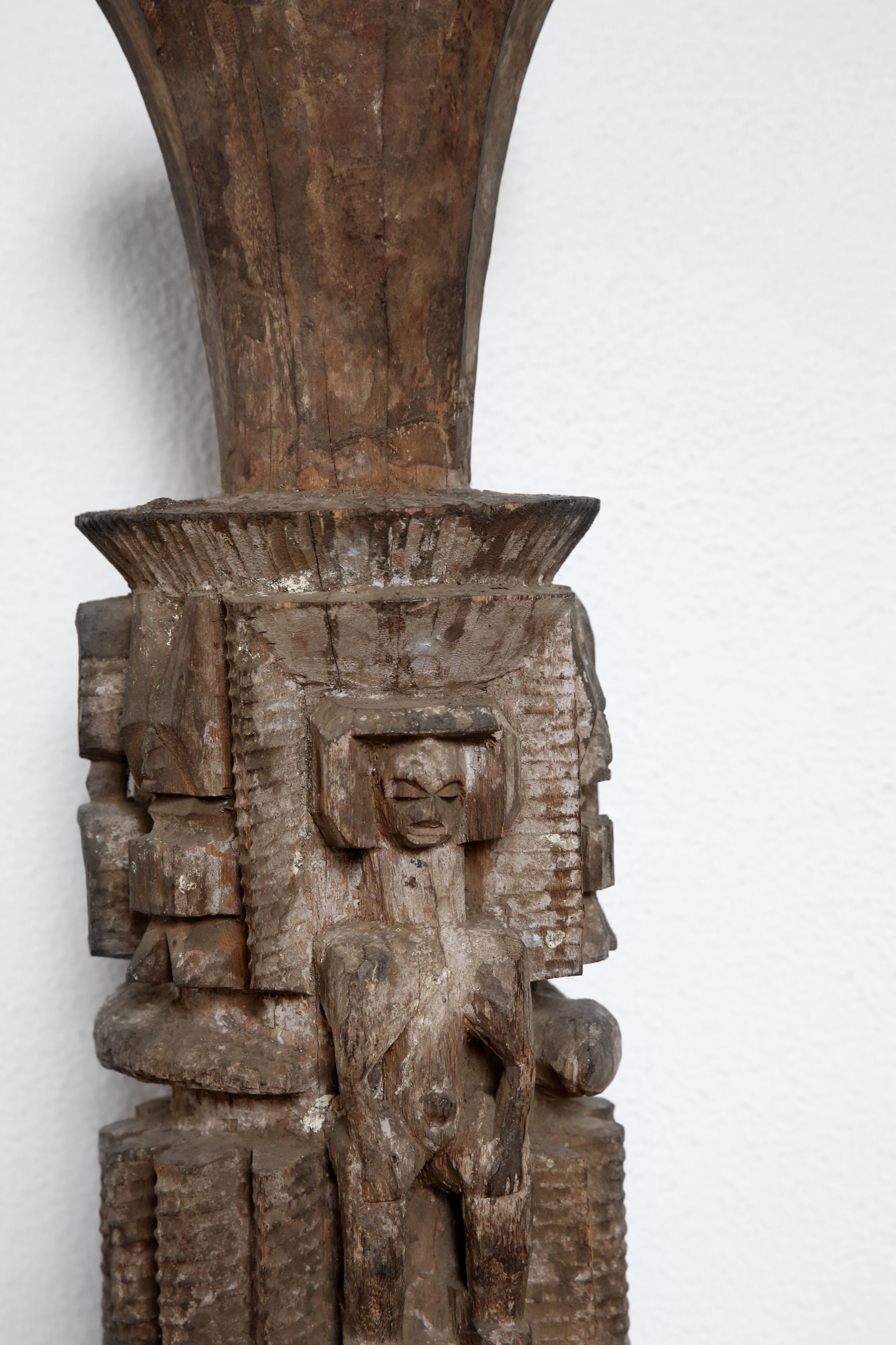 Most of these figures left Igboland in large numbers during and just after the Nigeria- Biafra civil war (1967-1970). During the war years literally thousands of Igbo art objects were burned, destroyed or lost; many others left Nigeria, partly because of the permeability of the border between Nigeria and Cameroon, when everyone was focusing on the war. By the time the war began, an influx of Christianity and Islam had deprived shrine figures of their original meaning, but they started a new life as collectible artworks in public and private collections in Europe and America. Earlier in the 1950s and 1960s community cult shrines had already begun to detoriate from neglect, although their figural sculptures mostly remained intact. Two other sculptures from this master carver could be identified, one published by Alain Dufour in 2004, the other in the Marshall & Caroline Mount Collection (New Jersey). Their iconography is almost identical, notwithstanding the presence of a sculpted head on the upper section. Herbert Cole considers these stylistically closer to Igala ikenga forms than the more typical Igbo ones. He has suggested an Igala origin – more specifically from the Ibaji region adjacent to the northern Igbo – could also be possible (personal communication, 15 October 2015).